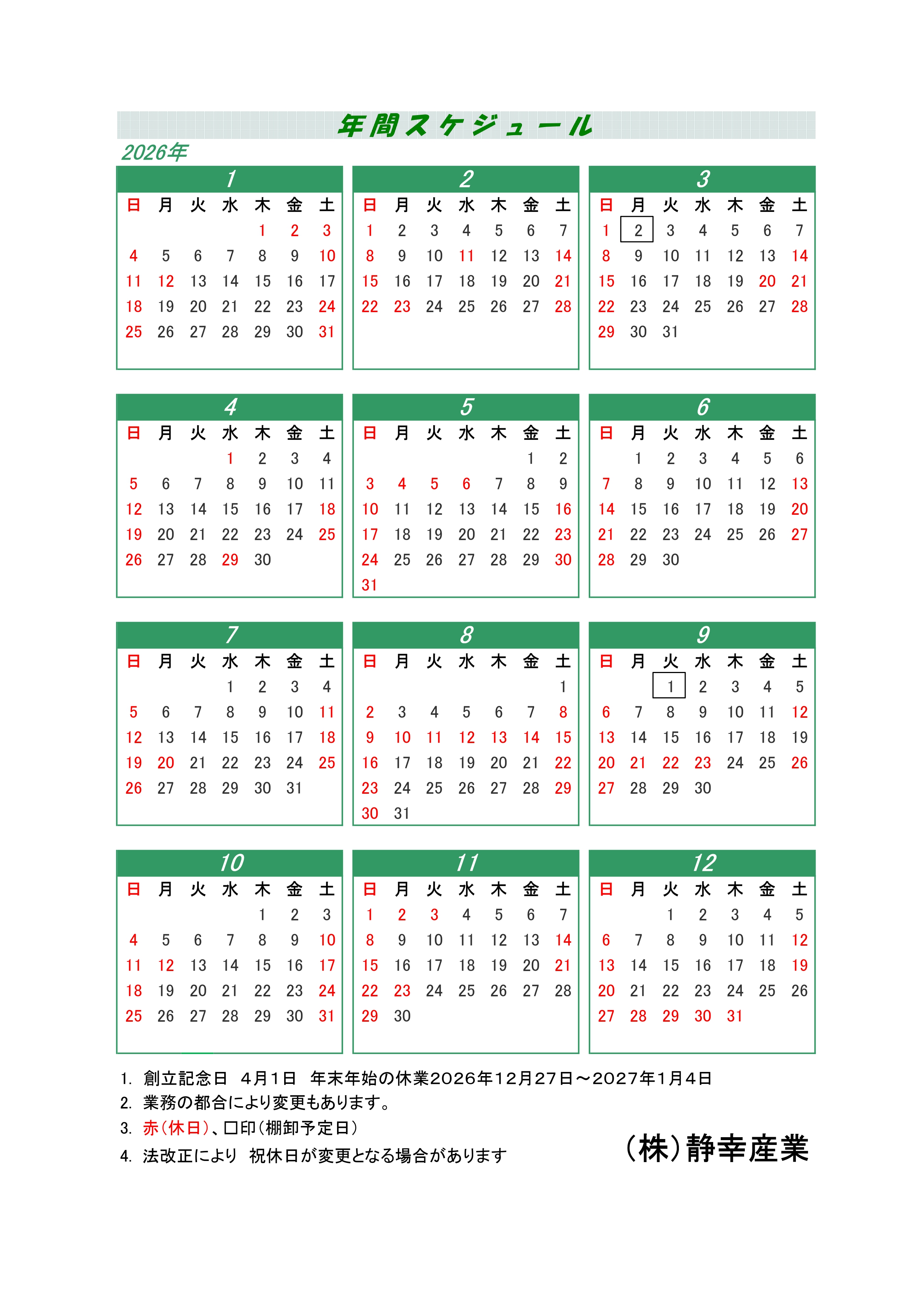 営業カレンダー